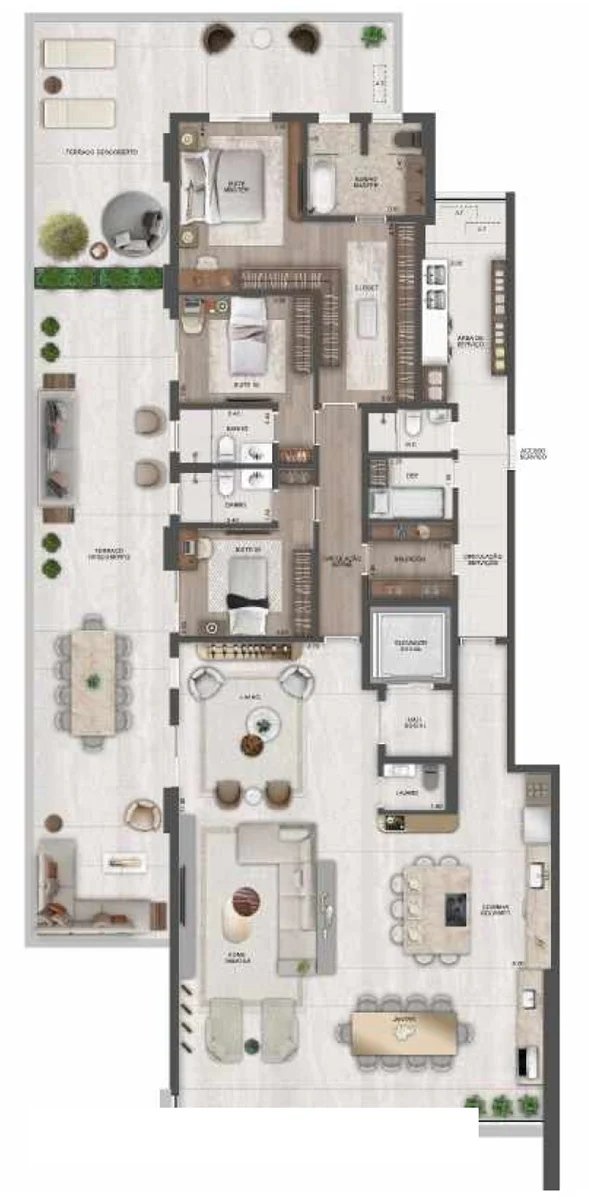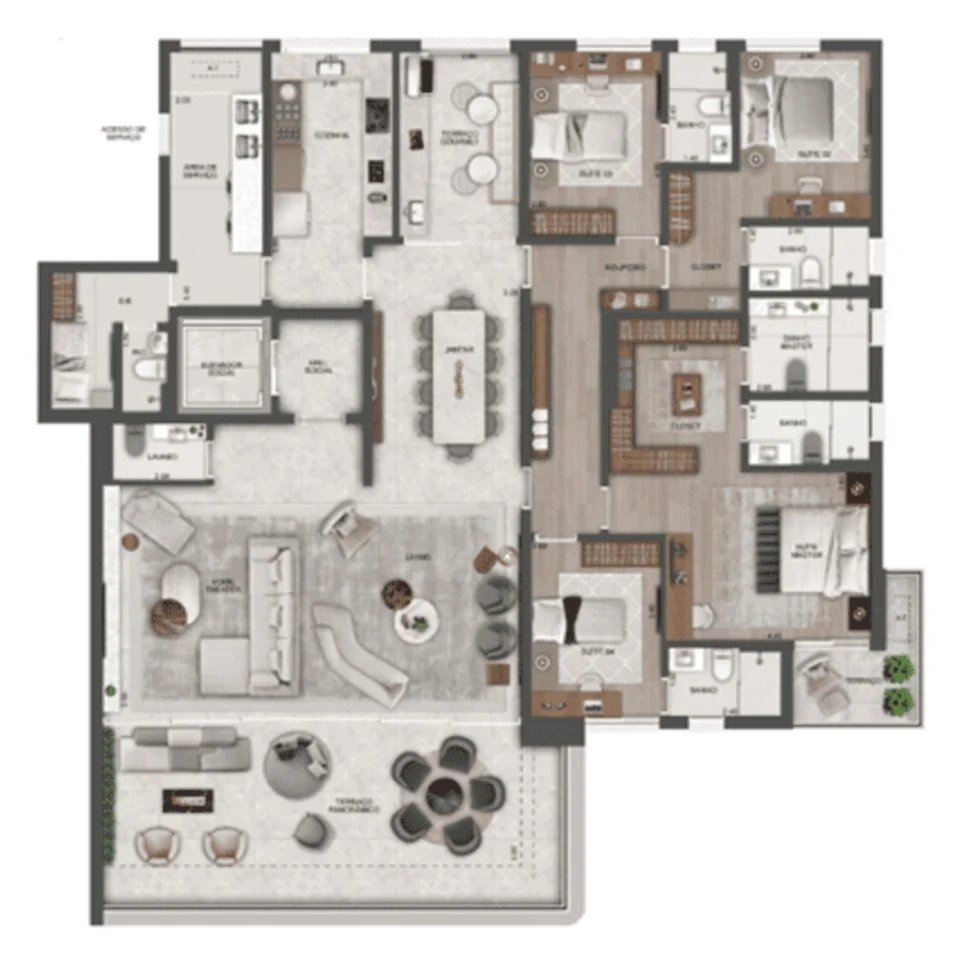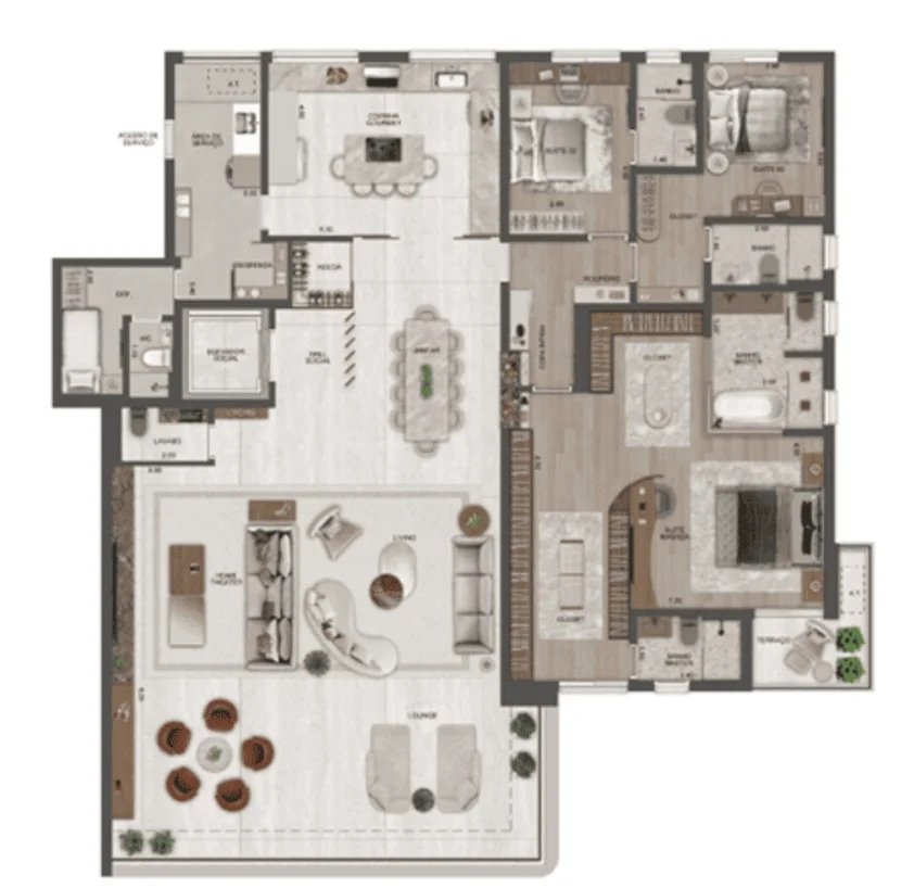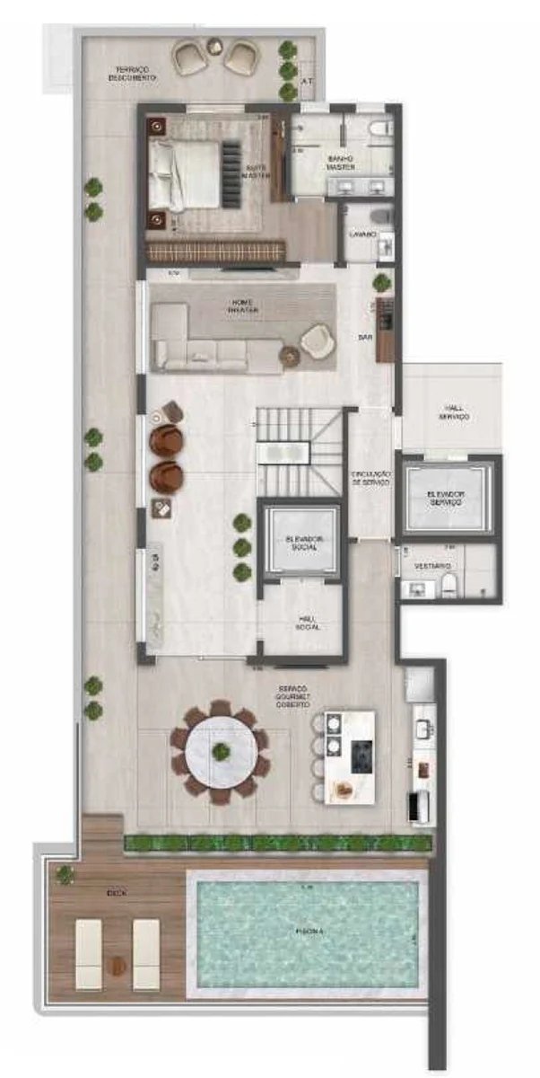 As penthouses são plantas que possuem uma área externa descoberta, mas a diferença para os gardens é que essas plantas ficam em andares altos, como por exemplo em um prédio de 20 andares ter penthouses no 10º andar.