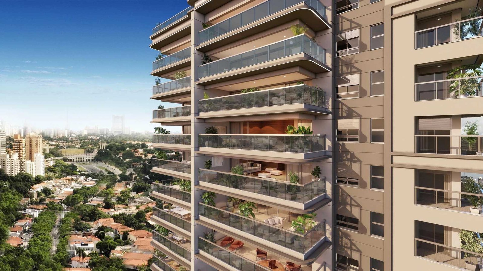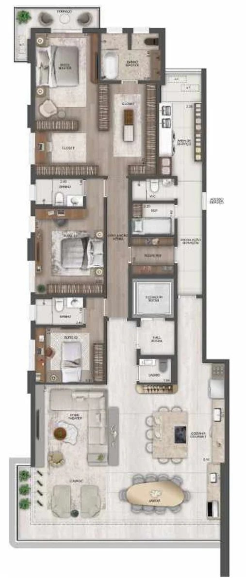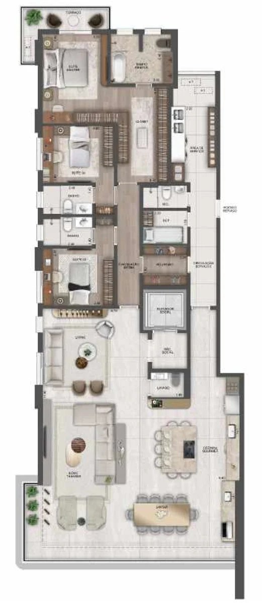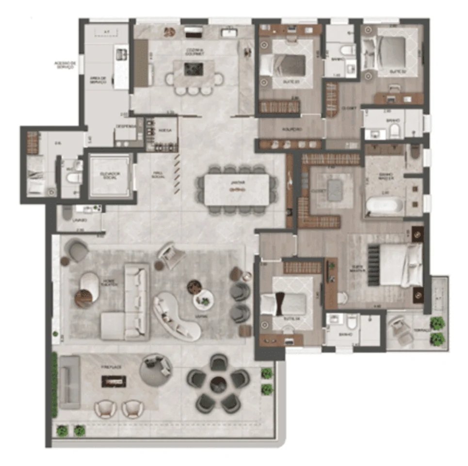 As penthouses são plantas que possuem uma área externa descoberta, mas a diferença para os gardens é que essas plantas ficam em andares altos, como por exemplo em um prédio de 20 andares ter penthouses no 10º andar.
